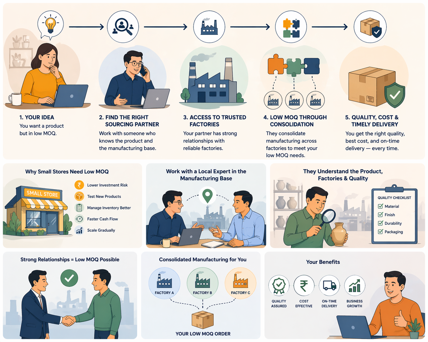 The irony is that Indian manufacturers are uniquely capable of producing exactly what discerning independent retailers want: handmade, artisanal, ethically produced, beautifully designed. But their pricing models and MOQs are built for volume buyers. The small retailer falls through the gap.