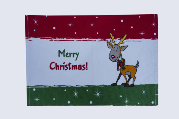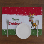 Festive 100% cotton placemat in ribbed weave, featuring multicolor screen-printed Merry Christmas text and cartoon design. Durable, easy to wash, and ideal for seasonal collections and wholesale sourcing