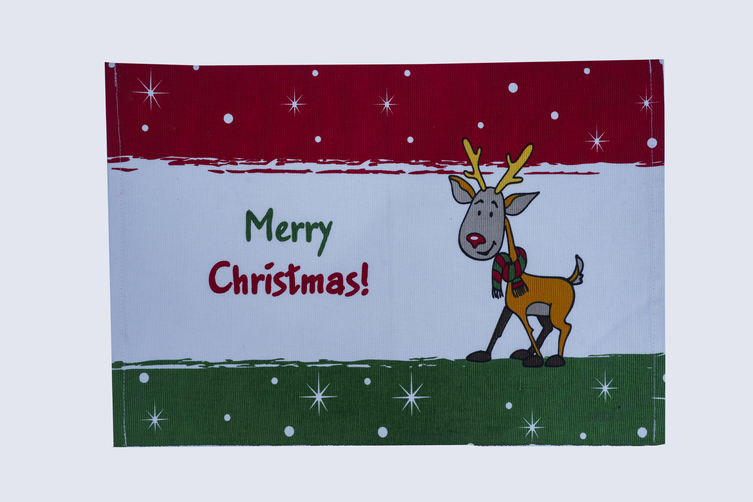 Festive 100% cotton placemat in ribbed weave, featuring multicolor screen-printed Merry Christmas text and cartoon design. Durable, easy to wash, and ideal for seasonal collections and wholesale sourcing