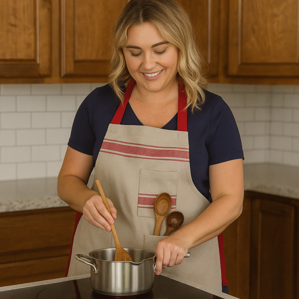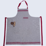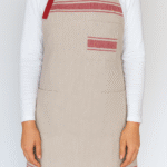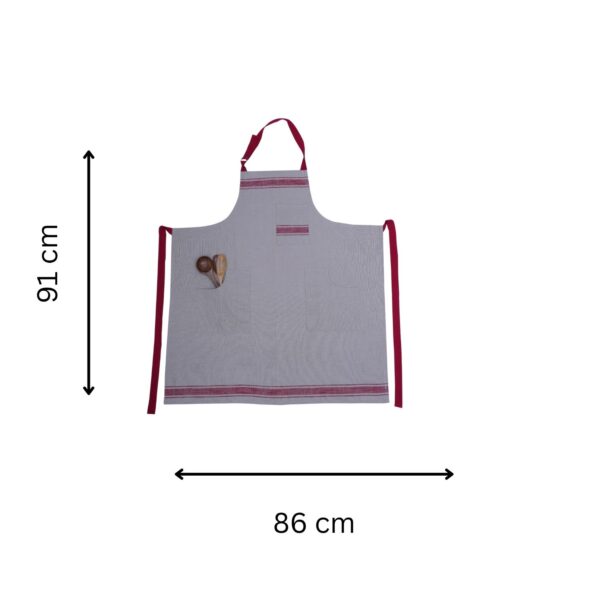 Durable cotton kitchen apron featuring elegant red stripe detailing and functional pockets. Made from 300 GSM plain weave cotton, offering comfort and protection for culinary or hospitality use. Customizable in size, color, and fabric.