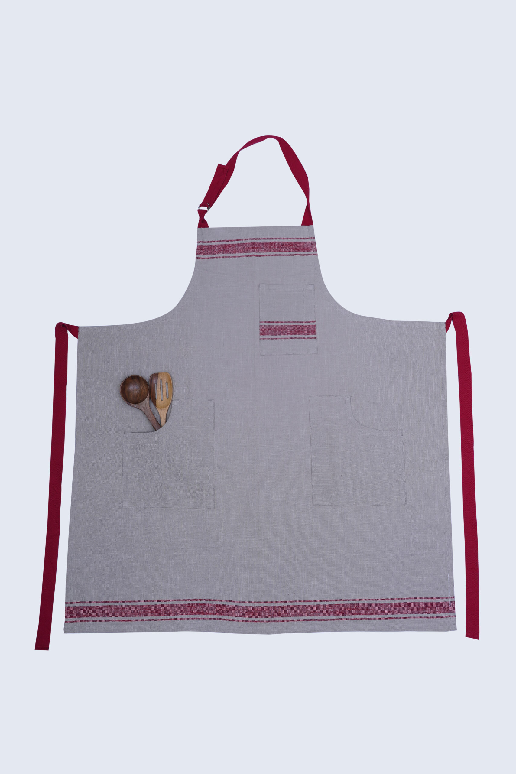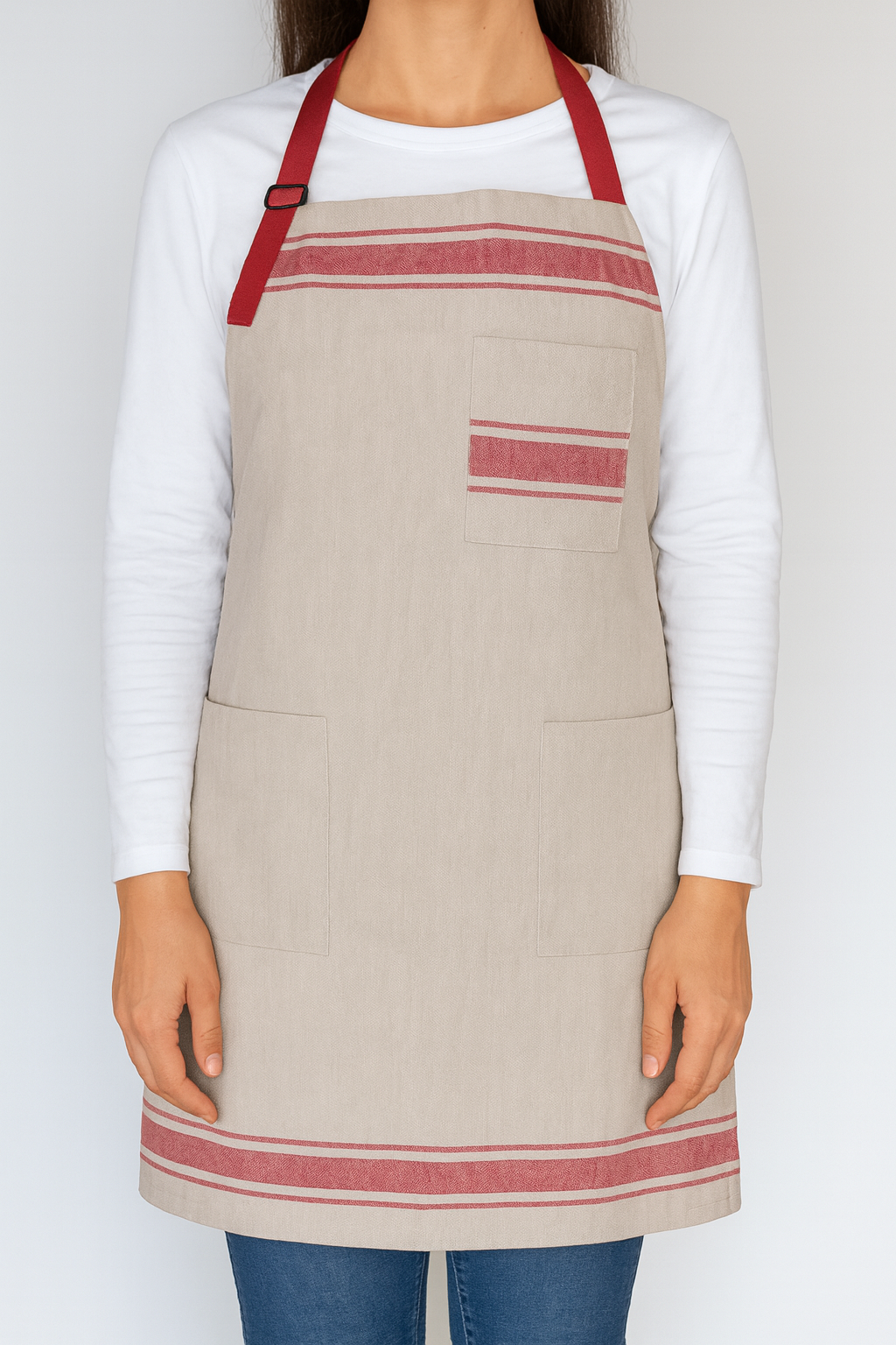 Durable cotton kitchen apron featuring elegant red stripe detailing and functional pockets. Made from 300 GSM plain weave cotton, offering comfort and protection for culinary or hospitality use. Customizable in size, color, and fabric.