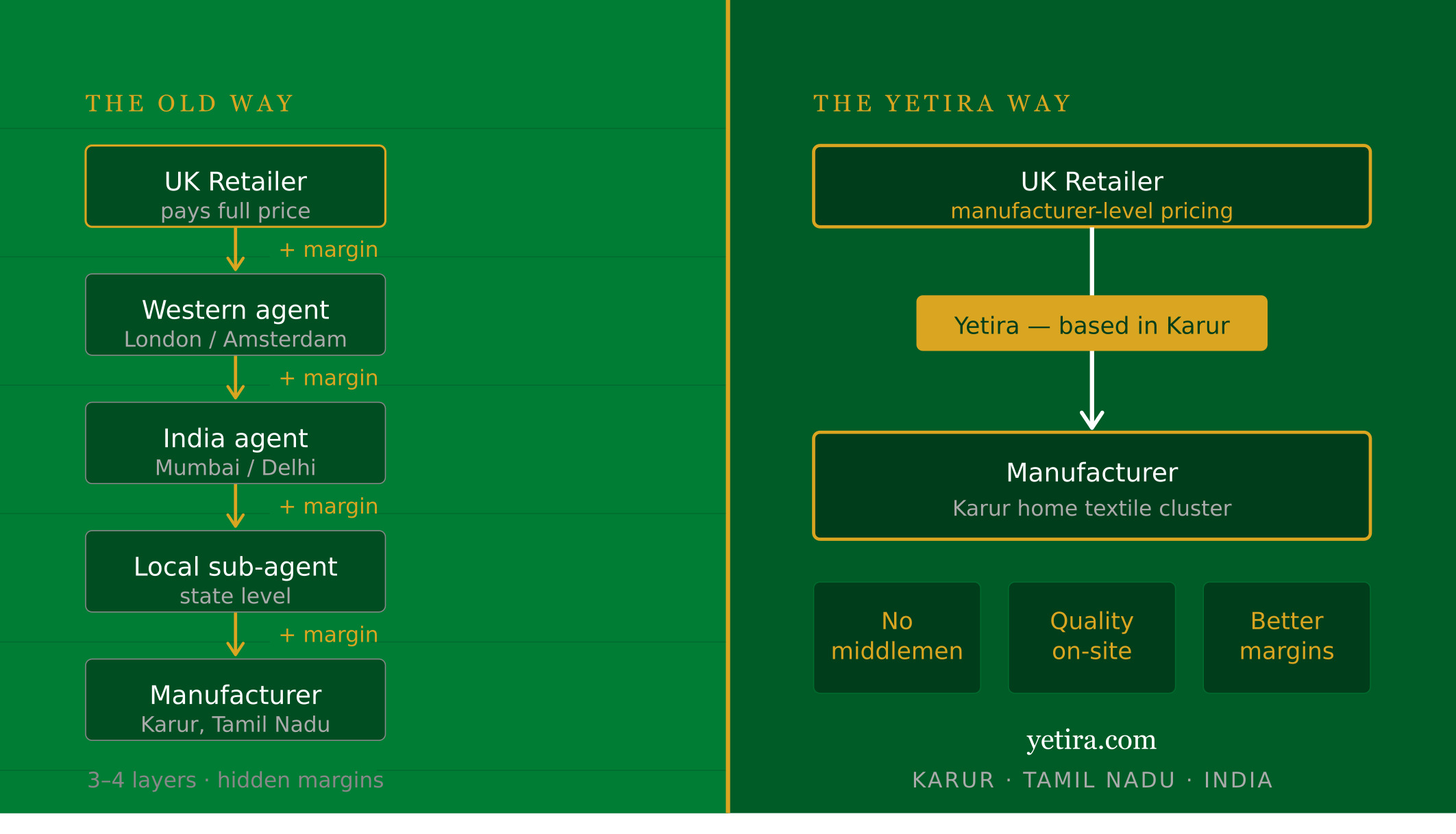 Yetira is a Karur-based sourcing agency connecting UK, US, and European brands directly with Indian home textile manufacturers. No middlemen. Full transparency.